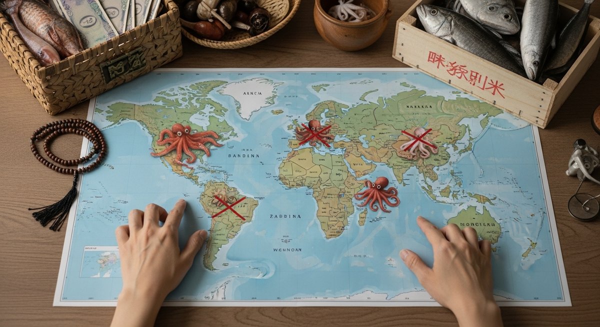 中東では一部地域で魚介類の扱いが細かく分かれるため、軟体動物を避ける人がいます。内陸部のアフリカや南アジアでは単純に流通が追いつかず、タコが日常食になっていません。北米ではタコは食材として存在しますが、他の魚介類に比べて一般的ではなく、好みや文化で消費が限定されます。