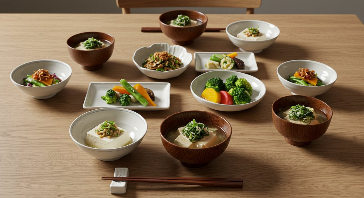 ベジタリアン和食の魅力は、食材本来の味を引き出しながら、栄養バランスに優れている点にあります。野菜、豆類、穀物を組み合わせて主菜・副菜・汁物をそろえることで、タンパク質やビタミン、ミネラルも十分に摂取できます。また、和食の調味料は醤油(ショウユ)、味噌(ミソ)、みりん(甘味を加える発酵調味料)など植物性のものが中心なので、調理の幅も広がります。